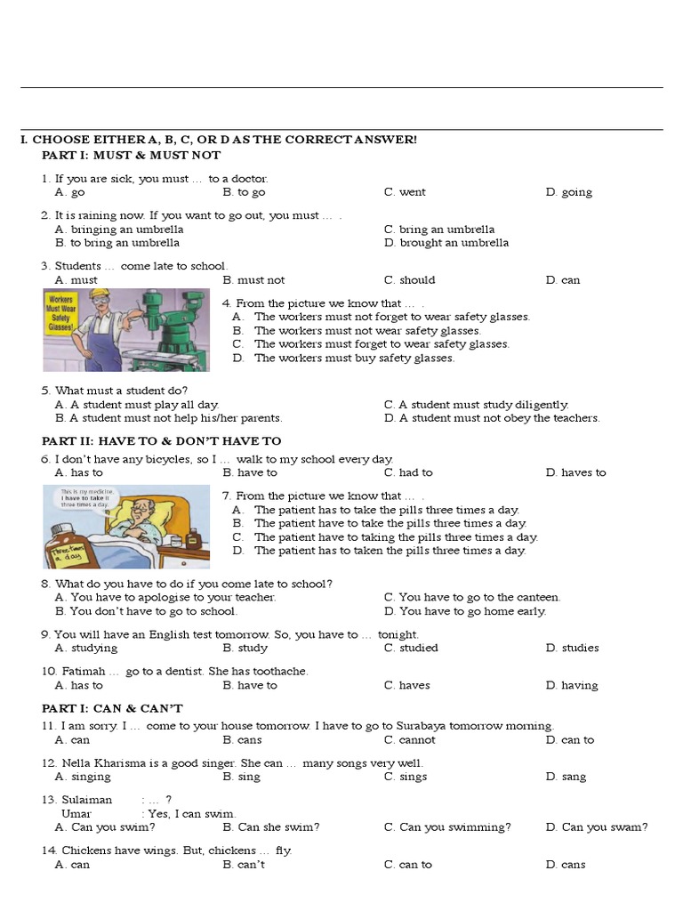Soal Must Have to dan Should Pilihan Ganda Modals of Obligation By DBI 31 Jan 2019 6 comments Must Have to dan Should adalah modals yang biasanya digunakan untuk menyatakan obligations atau kewajiban. Adapun materi susunan soal mencakup materi kelas 8 bahasa Inggris semester ganjil yaitu asking and giving attention asking and giving opinion capability modal verbs must and should notice procedure text instruction invitation greeting card dan. Jangan lupa share ke teman teman kalian apabila kalian merasa artikel ini bermanfaat untuk kalian.