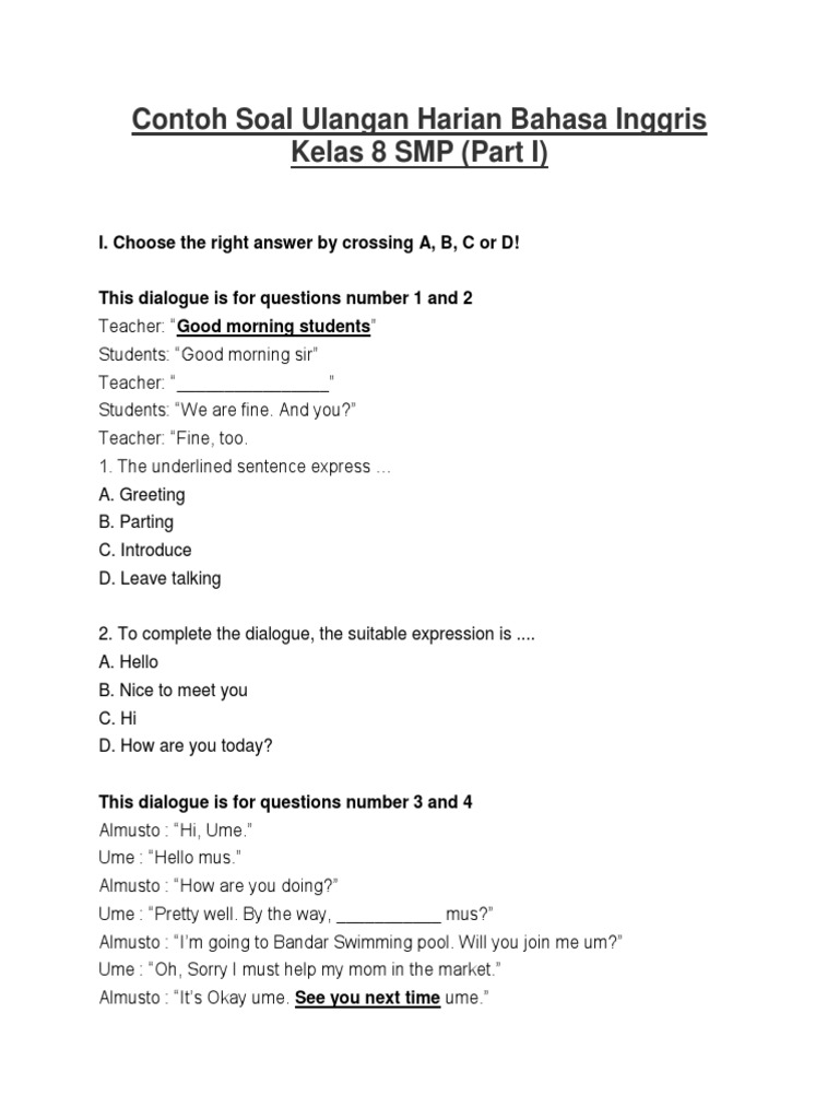 Ulangan Harian Materi 5 6 7 Ulangan Harian Materi 5 6 7 Soal Ulangan Harian Tik Soal Ulangan Harian Tik Contoh 1 Ulangan Bahasa Inggris Online Smp Kelas 7 Contoh 1 Ulangan Bahasa Inggris Online Smp Kelas 7. SMP Kelas 8 - B. The following dialog is for questions 1 and 2.