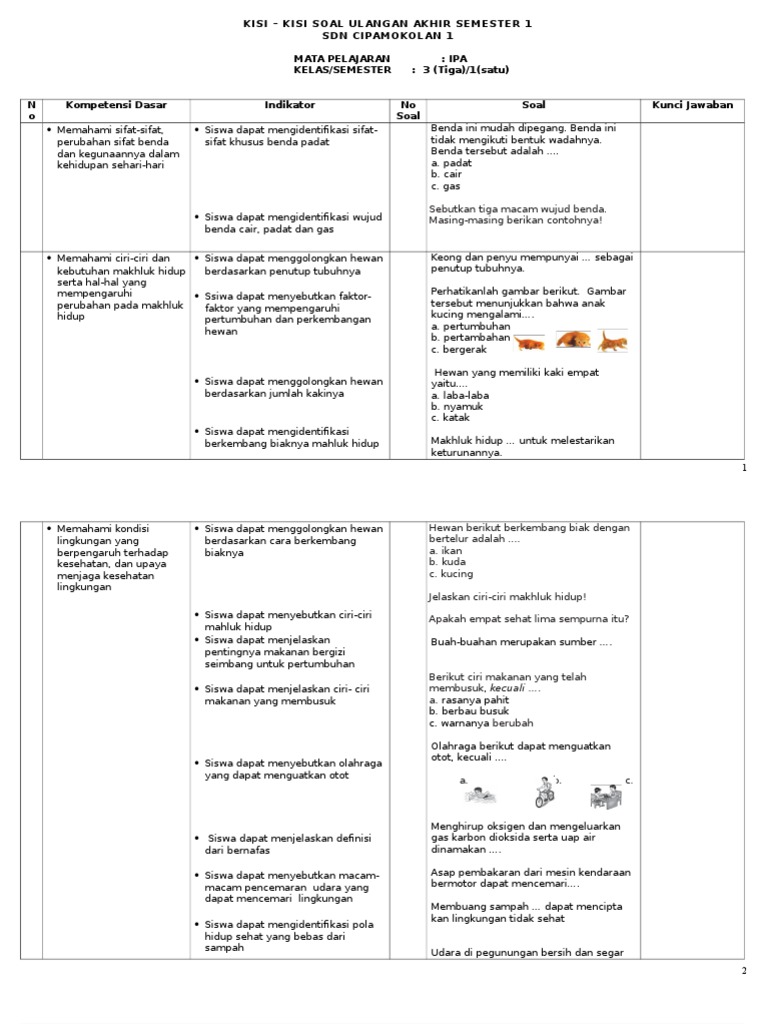 Kisi Kisi Soal Uas Ipa Kelas 3 Smtr 1 Asli