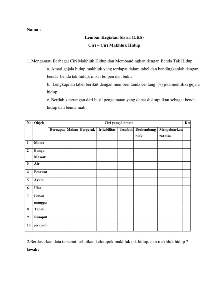Lembar Kegiatan Siswa Lembar Kegiatan Siswa Ciri Ciri Makluk Hidup