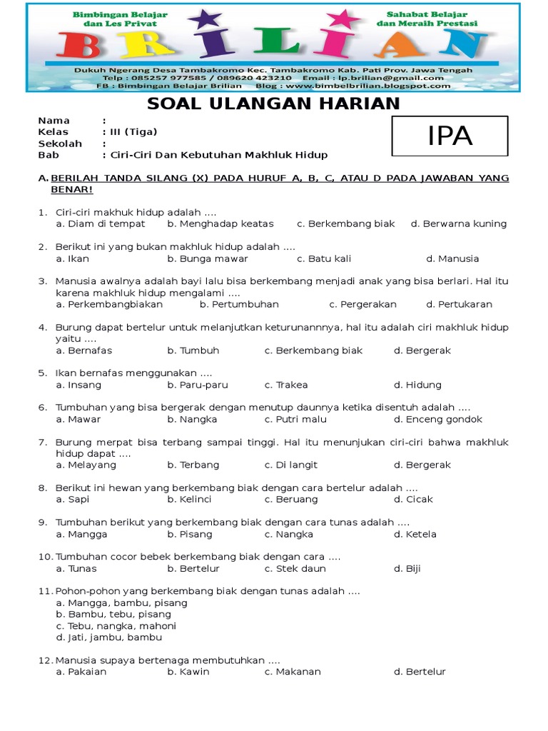Soal Ipa Kelas 3 Sd Bab Ciri Ciri Dan Kebutuhan Makhluk Hidup Dan Kunci Jawaban Bimbel Brilian